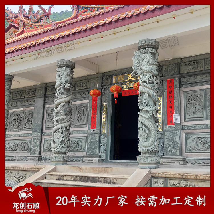 石雕龍柱在當今社會的應用非常廣泛,通常在寺廟、廣場、公園等都可以見到石雕龍柱,安裝在寺廟的龍柱較為常用石料的是青石龍柱,且工藝要求高。寺廟石雕龍柱由多種工藝制作,有圓雕,透雕,線雕,平雕,浮雕等工藝。石雕龍柱外形有圓形石雕龍柱和棱形石雕龍柱。泉州青石龍柱廠家,選匠心制作二十年,龍創石雕。